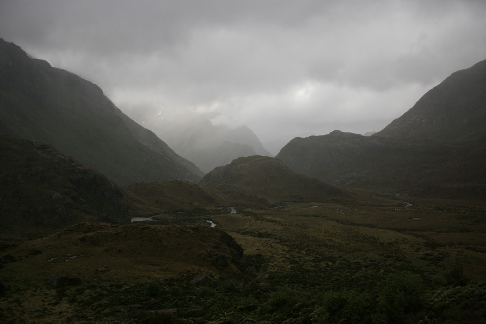 We woke up to rain falling on the roof of the hut and got on the trail as quickly as we could. The swirling clouds gave the valley a ghostly look. Gone were the impressive peaks of the day before but in their place were mountains shrouded in mystery. It rained on us until we reached Harris Saddle. At that point the sun broke through and a rainbow appeared out of the mist. It was an incredible sight and a good sign for the rest of our walk that day. From there on we did not experience a drop of rain and the wind at our backs dried us out. At times the wind gusted so strongly that we felt like a helping hand was pushing us along. It did not bother us, but we felt for the people who were walking in the other direction.
